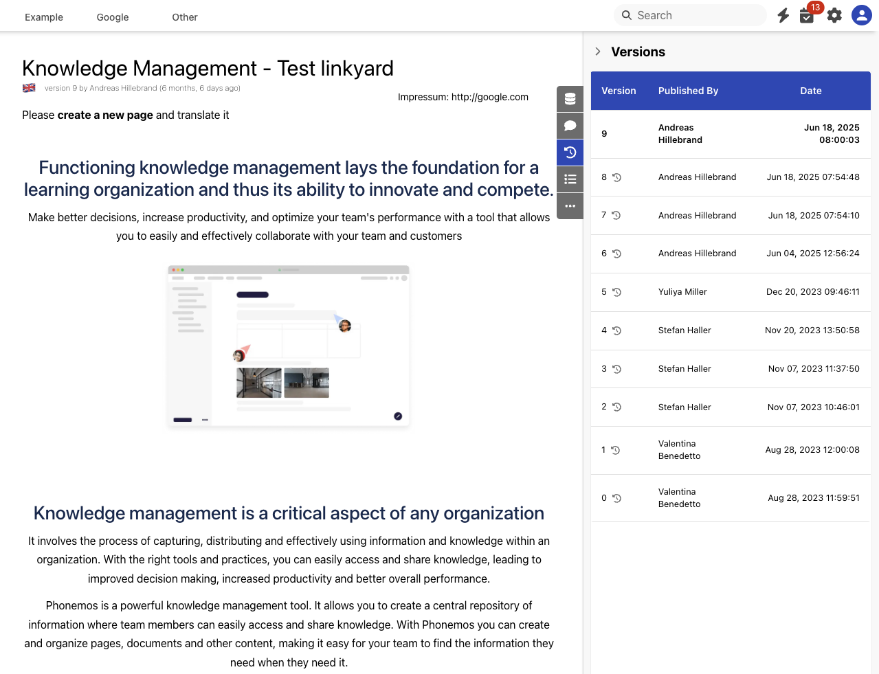 With the sidebar on the right, you can retrieve older versions of the object by clicking on the version number or restore it as the newest version with the restore icon next to it.