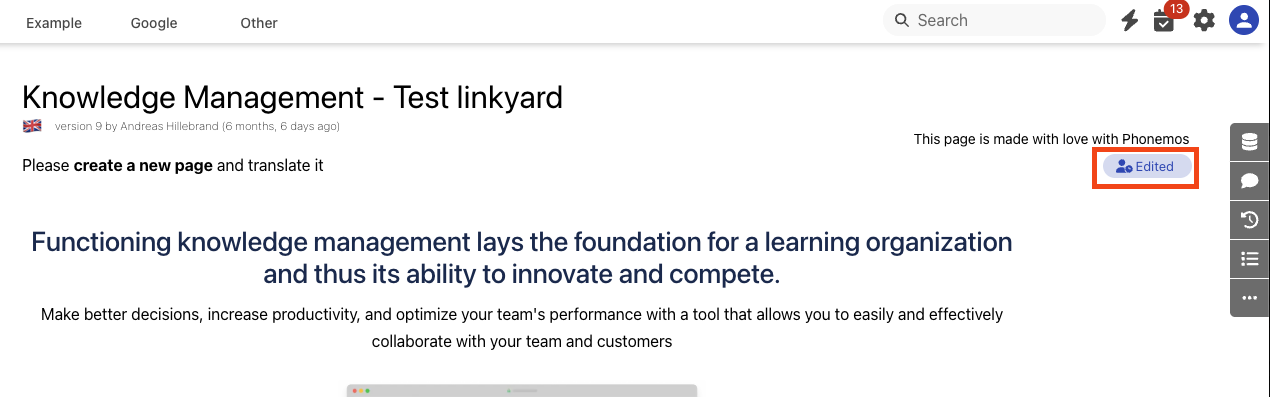 Once you start editing a page, Phonemos creates a draft version of your page. All your changes in this draft are immediately and continuously saved in the new draft version. Whenever saving is in progress, you see an indicator on the very top right of the page.