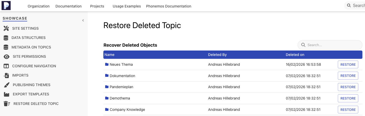 In order to restore a deleted object from trash, as a topic manager, open the topic settings and navigate to recycle bin. You will find a list of deleted objects that you can restore.