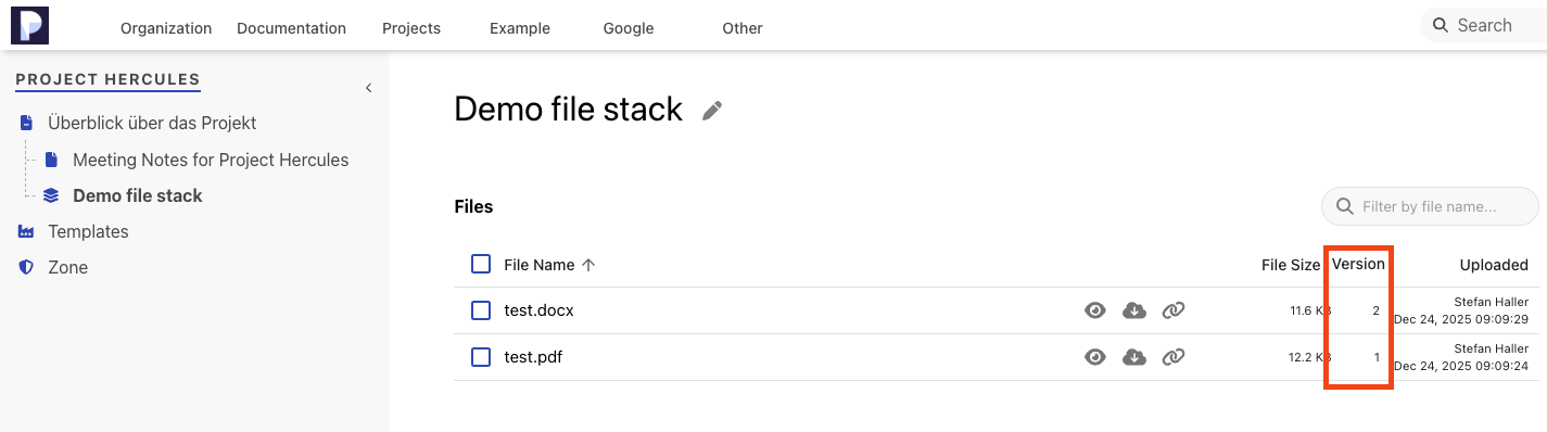 Versioning of files in file stacks