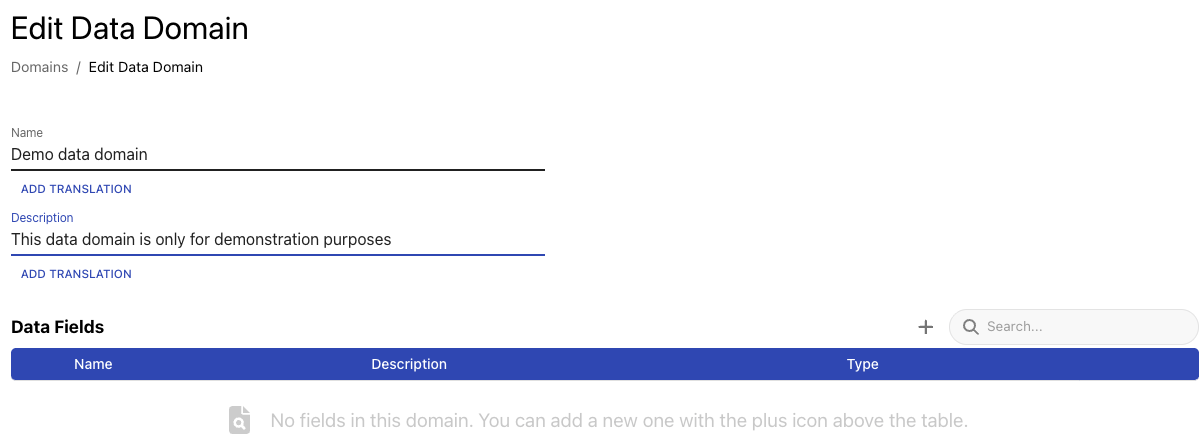 After naming the data domain, we can add fields to it with the +-icon.