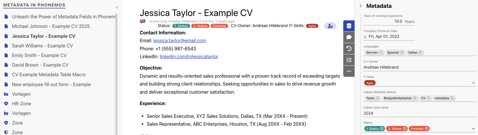 You can now use these fields to attribute metadata value to your objects. We build an example with a list of CVs of employees.