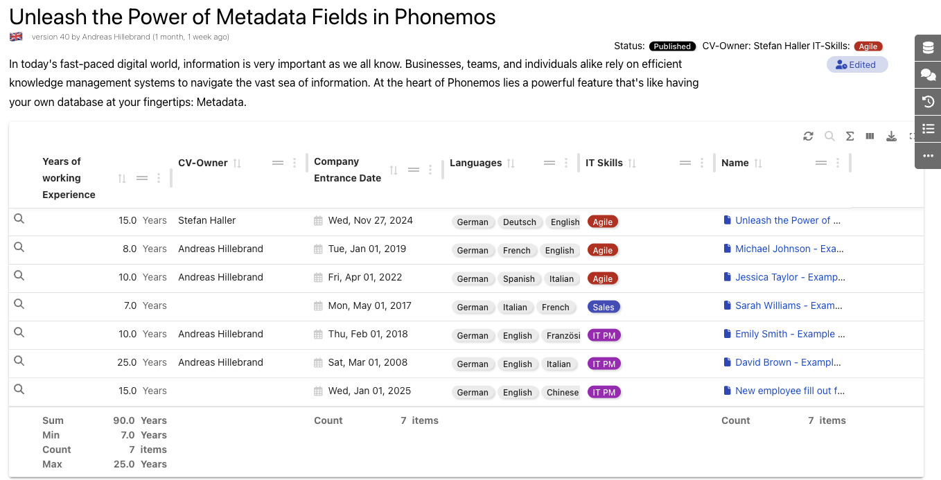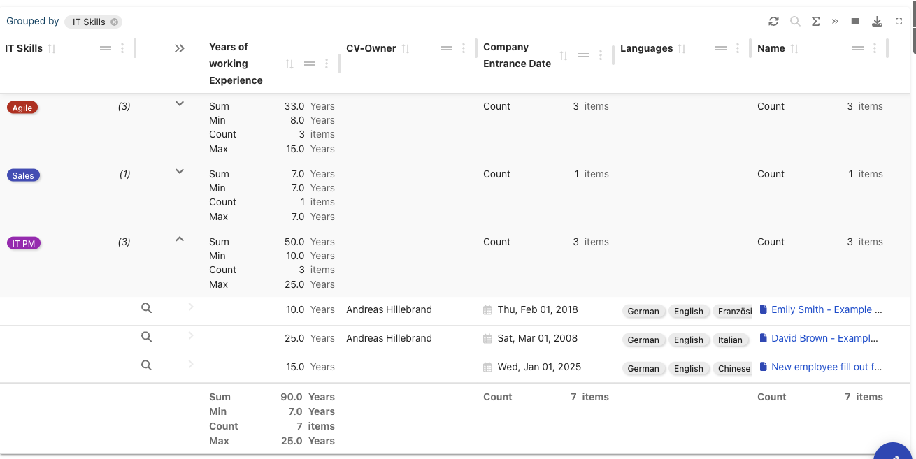 Please note that you can add mathematical functions like sum to show how many years of working experienced the employees have combined. Data tables can be sorted and grouped. In this example, we group the table by the field “IT Skills”.