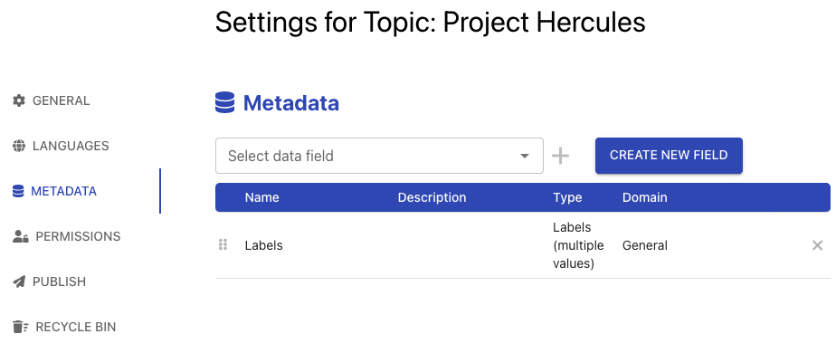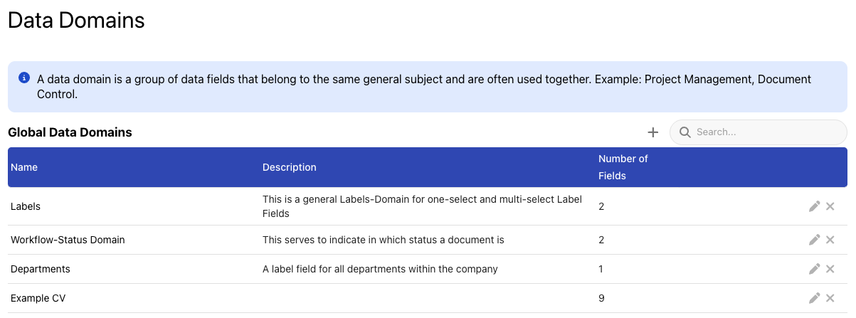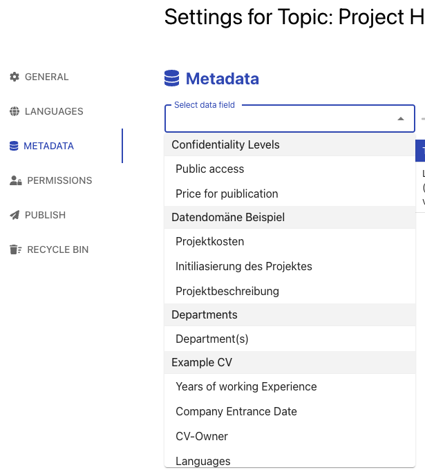 A data domain is a grouping mechanism for metadata fields. The UI will group metadata fields belonging to the same group together, but it is possible to only activate and use certain fields out of a data domain in specific topics.