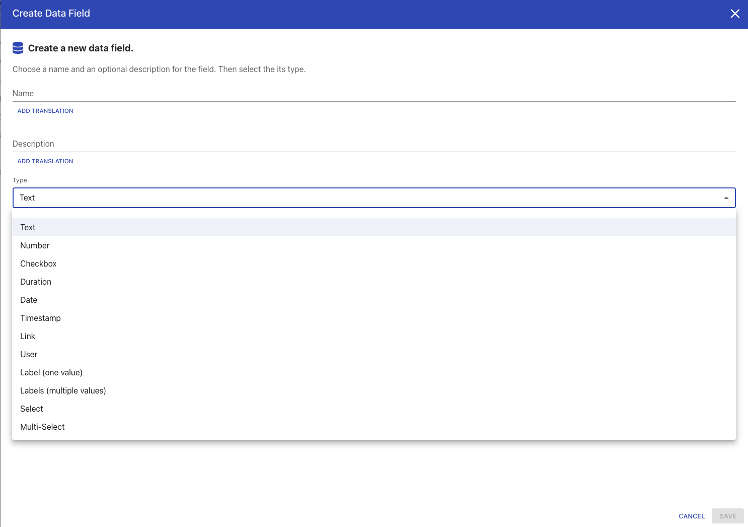 Label (one value) | Will allow people to attribute no or one label from a list of labels to this object, including adding a new label. If you don’t want people to add new labels, use the Select data type. |