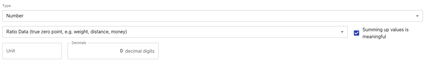Number | A number field with a detailed configuration of decimal places and units. ![]() In data tables, we also perform functions on these fields like building sums and averages. If your number is a product code, summing up such an arbitrary number does not make sense. Use the checkbox to indicate whether mathematical functions produce meaningful values. |