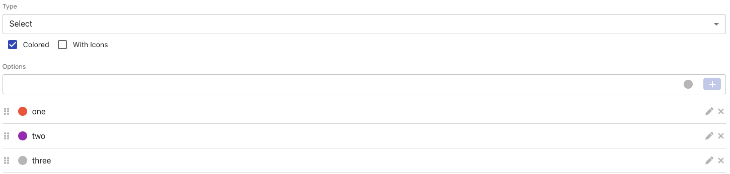 Select (one value) | Works similar to labels, but users cannot add new options, meaning there is a label cage of predefined options. In addition, you can also define colours or icons for each selection option. ![]()