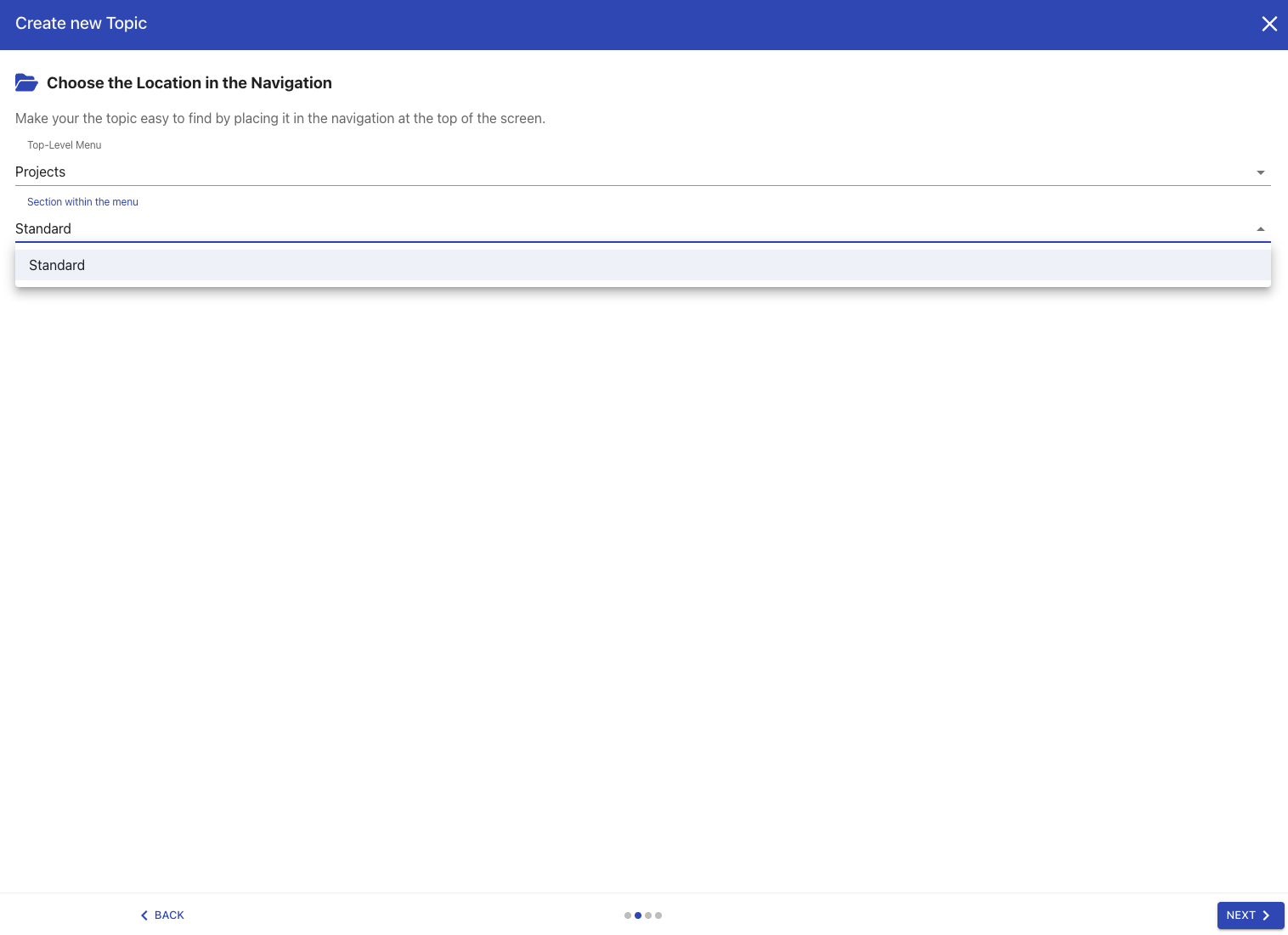 When you create a new topic, the topic creation wizard always asks where in the menu you would like to add a topic.