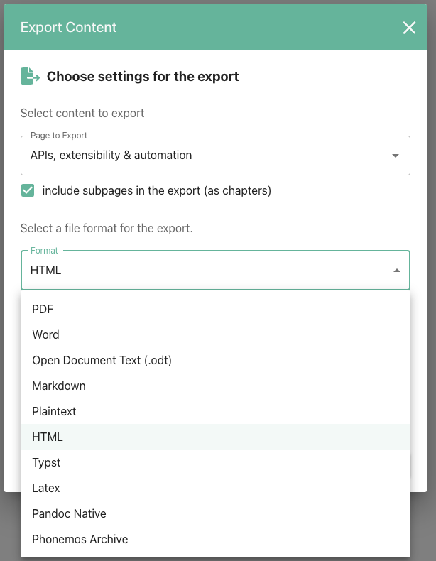 You may choose to export only a single page or the entire page tree.