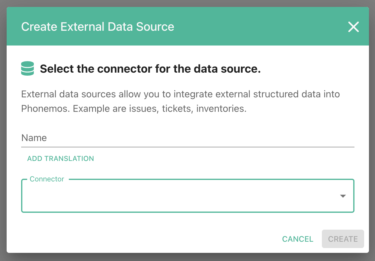 If you cannot see the “Integrate External Data” in the create menu or you cannot see the connector: Contact the application provider, they need to enable it first.