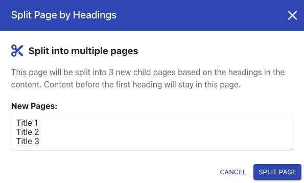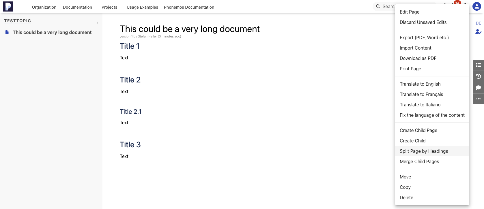 This will split a page into subpages for each main heading. This is especially useful if you imported a bunch of office documents and you want to turn them now into wiki pages. Use the “…” menu in the sidebar to find the menu item “Split Page by Headings”.