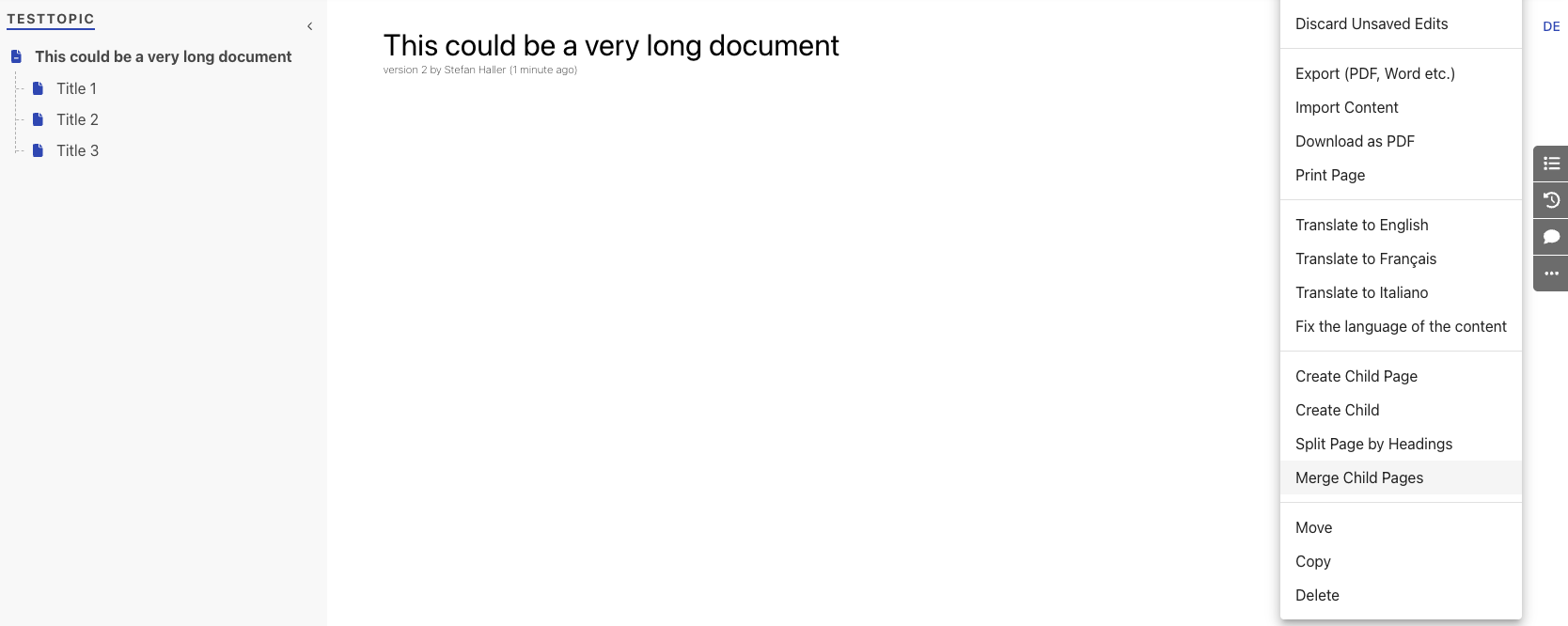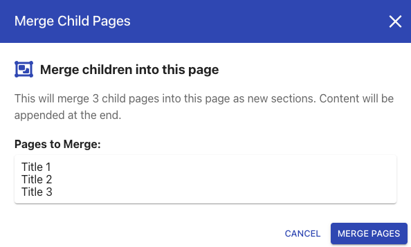 This is the reversal of above split function. Open the parent page you want to merge child pages into and use the “…” menu in the sidebar and select merge child pages.