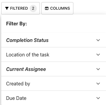 The “My Tasks” view will by default show you all open tasks assigned to yourself. You may customize the column to display inthe table using the columns button.
