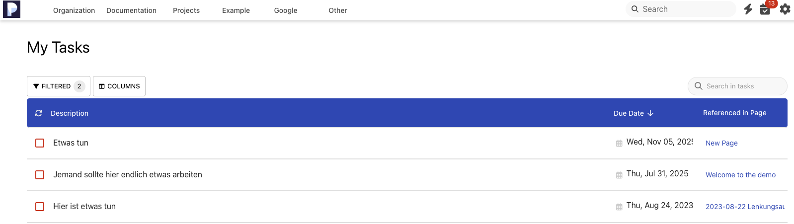 To create a new task, insert one in any page via typing / in edit mode or using the +-toolbar in edit mode.