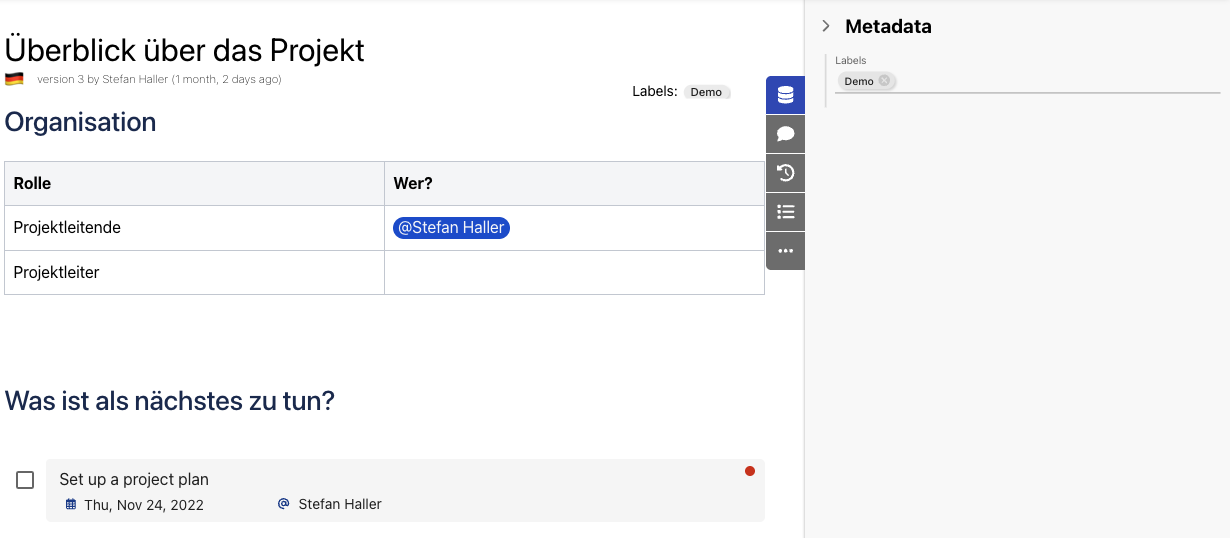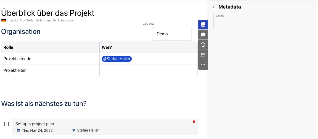 You can now add a label by selecting an existing one or by typing in a new name for a label. You can do so through the metadata pane on the right or if you put labels into your page info header, also by directly editing this in this header.