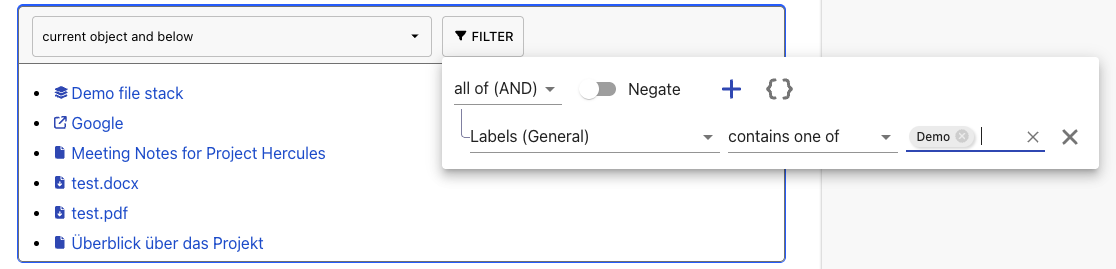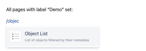 Use the object list widget to show all objects that have a certain label set. Add an object list widget to any page by typing / or clicking the +-icon from the toolbar in edit mode.