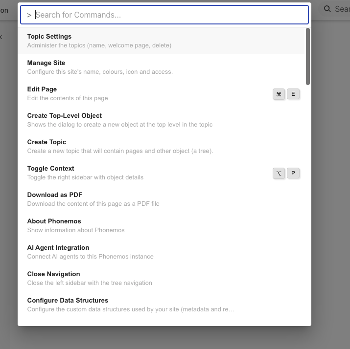 These shortcuts work while viewing a page (not in edit mode). Single-letter shortcuts are only active when focus is not on a text input.