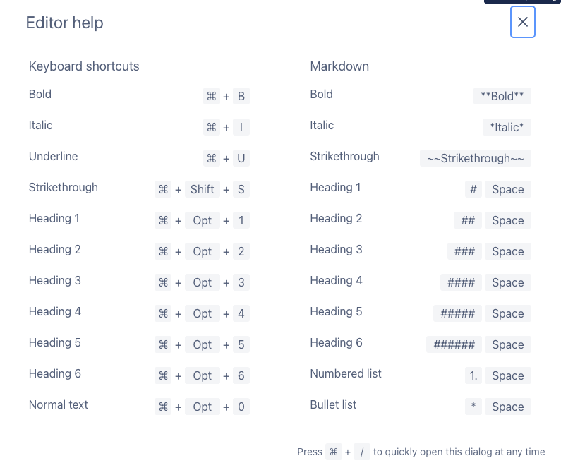 If you need to see the same keyboard shortcuts that are available in the editor, use /help to get a dialog popup explaining these.